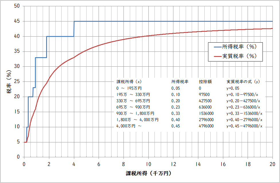 課税所得の範囲 (x) 税率 (Rn) 速算控除額 (Dn) 実質税率の式 (y) 0 〜 195万円 0.05 0 $y = 0.05$ 195万 〜 330万円 0.10 97,500 $y = 0.10 - 97,500/x$ 330万 〜 695万円 0.20 427,500 $y = 0.20 - 427,500/x$ 695万 〜 900万円 0.23 636,000 $y = 0.23 - 636,000/x$ 900万 〜 1,800万円 0.33 1,536,000 $y = 0.33 - 1,536,000/x$ 1,800万 〜 4,000万円 0.40 2,796,000 $y = 0.40 - 2,796,000/x$ 4,000万円 〜 0.45 4,796,000 $y = 0.45 - 4,796,000/x$ 3. グラフの特徴と注意点