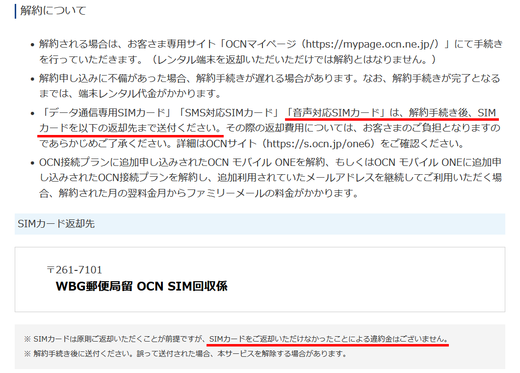 返却先は「WBG郵便局留 OCN SIM回収係」となっています。