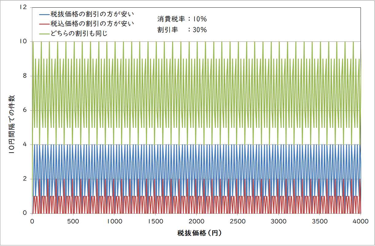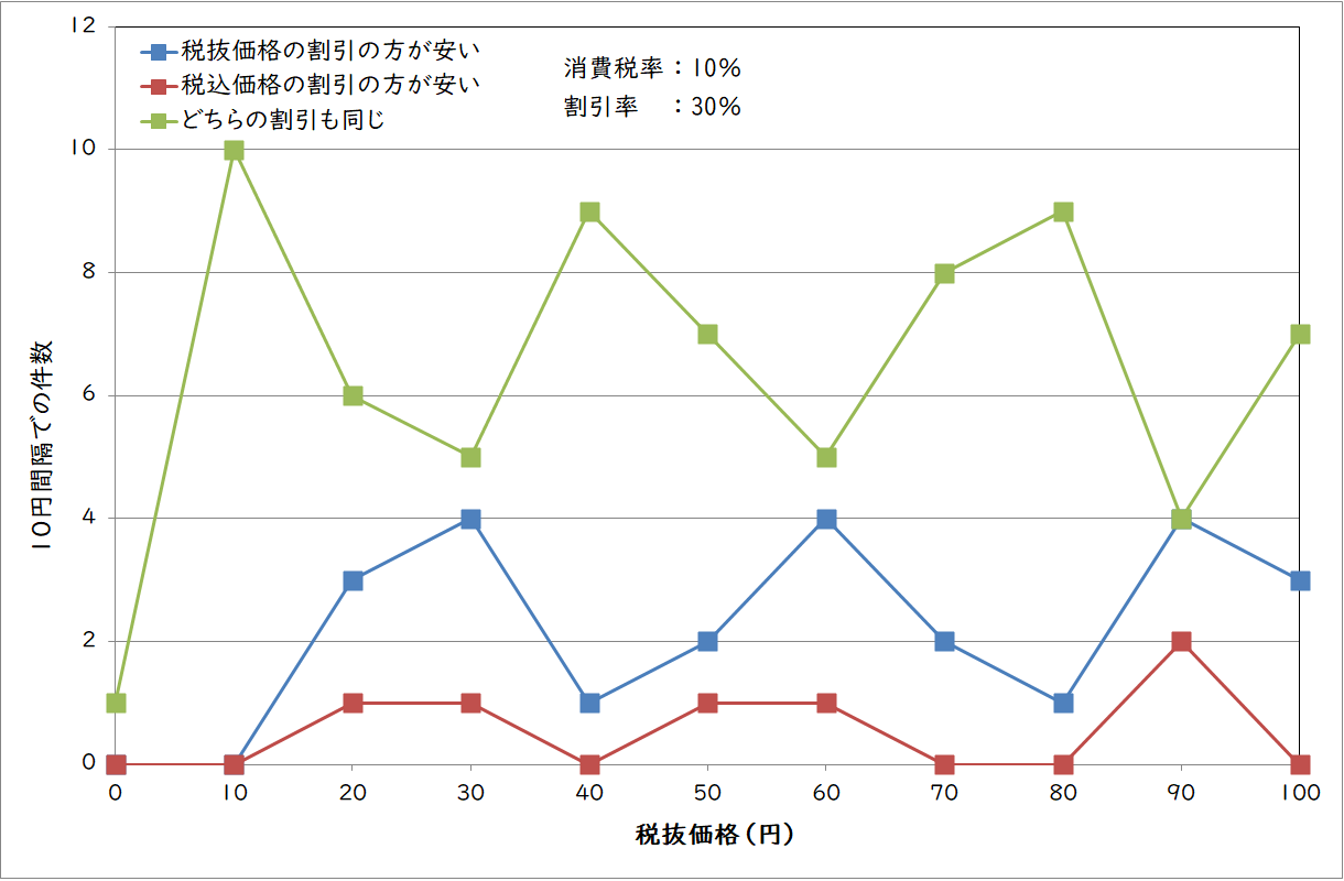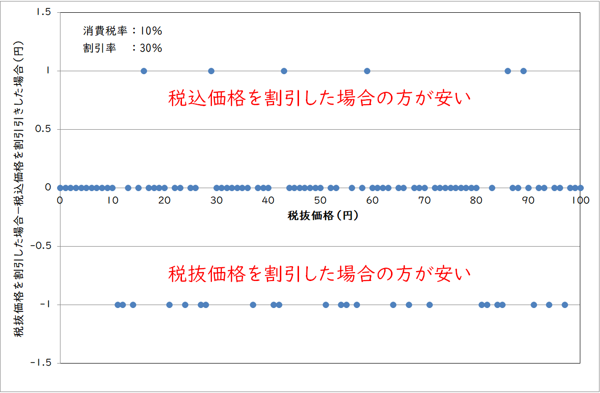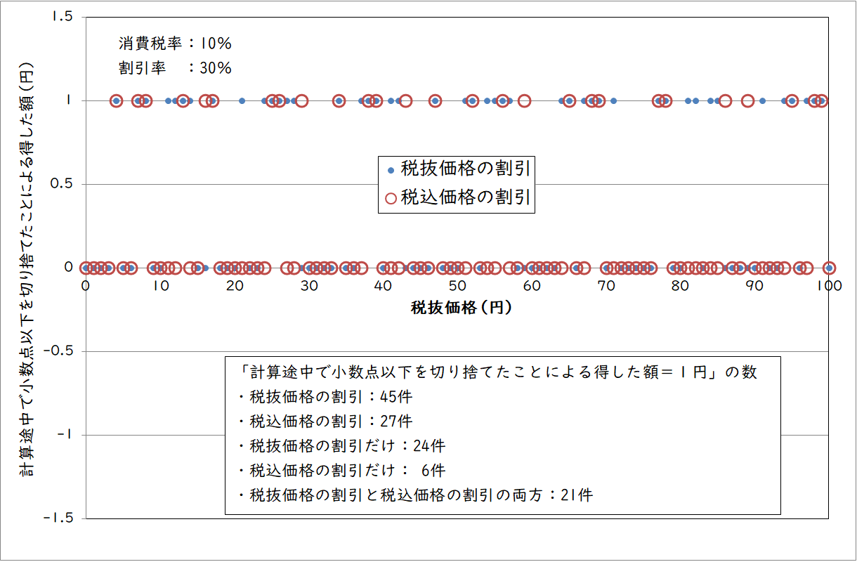 上記の税拭価格85円と86円の例を見ると、計算途中で小数点以下を切り捨てずに計算した場合、税拭価格85円の場合は65円で、計算途中で小数点以下を切り捨てて税抜価格を割引した場合は64円で1円得している。税抜価格86円の場合は、計算途中で小数点以下を切り捨てなければ66円だが、計算途中で小数点以下を切り捨てて税込価格を割引した場合は65円で1円得している。このように、税込価格を割引しても税抜価格を割引しても損しているわけではなく、どちらかが得している場合があるだけで、どちらも得している場合もある。その様子をグラフにすると、次のようになる。1円から100円までの間で、税抜価格の割引で得した回数が45件、税込価格の割引では27件、どちらも得した場合が21件である。税抜価格の割引の方が得しやすいことが分かる。